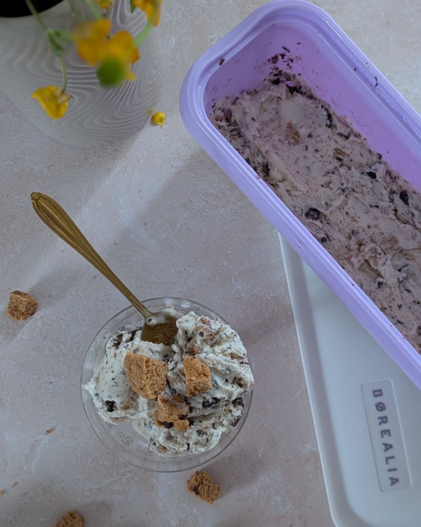 Pour obtenir une texture aussi onctueuse que celle des meilleurs glaciers, j’utilise mon alliée du quotidien : la Borealia, la turbine à glace et yaourtière de chez Guy Demarle.